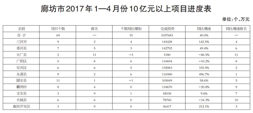 4、廊坊市2017年1-4月份10億元以上項(xiàng)目進(jìn)度表