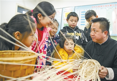 去年以來,固安縣將柳編、陶藝、臉譜、京繡等縣內(nèi)十多個國家級、省級非遺項目引入校園,通過非遺項目傳承人定期到學校給學生上課,擴大學生的知識面,促進傳統(tǒng)文化的保護和傳承。圖為柳編傳承人在該縣第三小學教學生柳編。