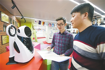 中關(guān)村軟件園創(chuàng)業(yè)基地,太庫(kù)創(chuàng)客空間工作人員正在記錄“維拉”智能機(jī)器人數(shù)據(jù)。?