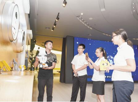 廊坊開發(fā)區(qū)騰訊眾創(chuàng)空間(廊坊)雙創(chuàng)社區(qū)路演中心,市民在與小蘿卜早教機互動。