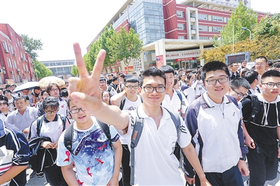 6月7日,2018年高考拉開(kāi)帷幕。圖為在廊坊一中考點(diǎn),一位考生走出考場(chǎng)時(shí)做出了“勝利”的手勢(shì)。? ?