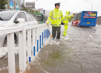 民警值守雨中,疏導(dǎo)車(chē)輛繞行,成了群眾安全出行的“路標(biāo)”。