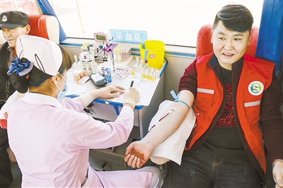 志愿者在市中心血站工作人員引領(lǐng)下,認(rèn)真填寫采血登記表,符合條件的志愿者配合醫(yī)護(hù)人員完成采血。