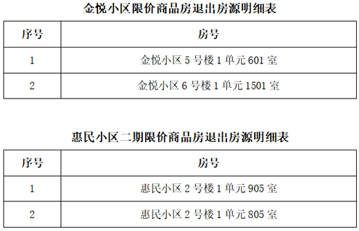 中號家庭自愿放棄購買退出的房源共計(jì)4套,其中金悅小區(qū)限價(jià)商品房退出房源2套,惠民小區(qū)二期限價(jià)商品房退出房源2套。