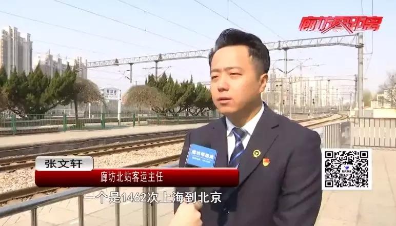 1462次(上?!本?列車,8:35到廊坊,9:10開車;K216(圖們—北京)列車,10:52到廊坊,10:55開車;K215次(北京—圖門)列車,14:12到廊坊,14:14開車。