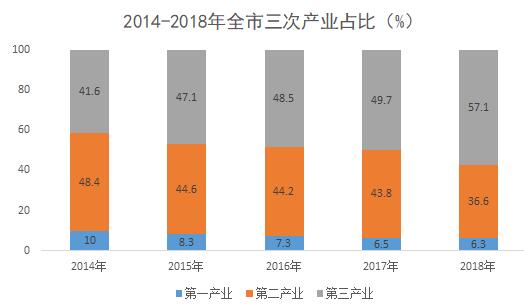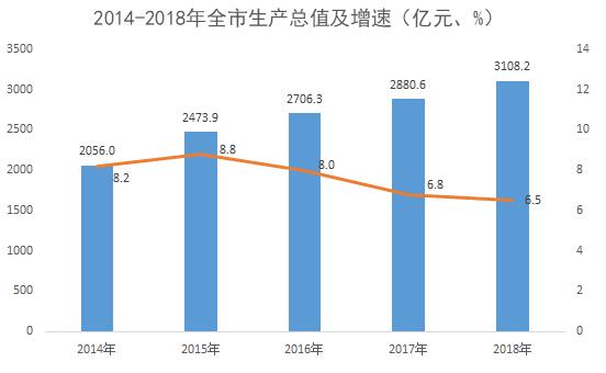 初步核算,全市生產總值完成3108.2億元,同比增長6.5%。其中,第一產業(yè)完成196.7億元,增長0.8%;第二產業(yè)完成1138.1億元,增長3.5%;第三產業(yè)完成1773.5億元,增長9.8%。全市人均生產總值為64906元,同比增長4.1%。