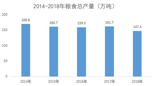 全年糧食播種面積435.2萬畝,同比下降5.7%;糧食總產量147.4萬噸,同比下降6.4%。其中,小麥播種面積92.7萬畝,下降2.9%,產量34.4萬噸,下降3.9%;玉米播種面積313.8萬畝,下降7.2%,產量105.6萬噸,下降8.2%。