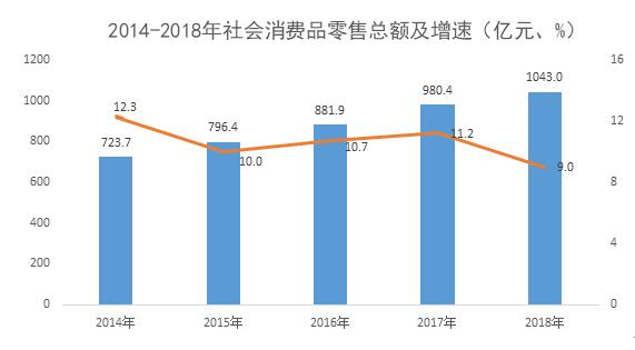 全年社會消費品零售總額完成1043.0億元,同比增長9.0%。其中,限額以上企業(yè)(單位)消費品零售額完成347.8億元,增長3.6%。