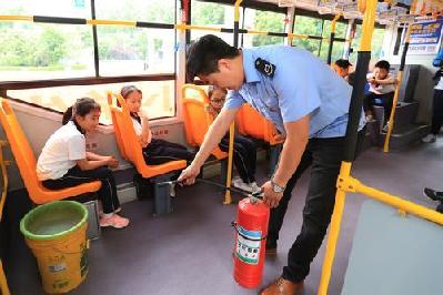 圖為公交公司工作人員演示如何使用車內(nèi)滅火器。