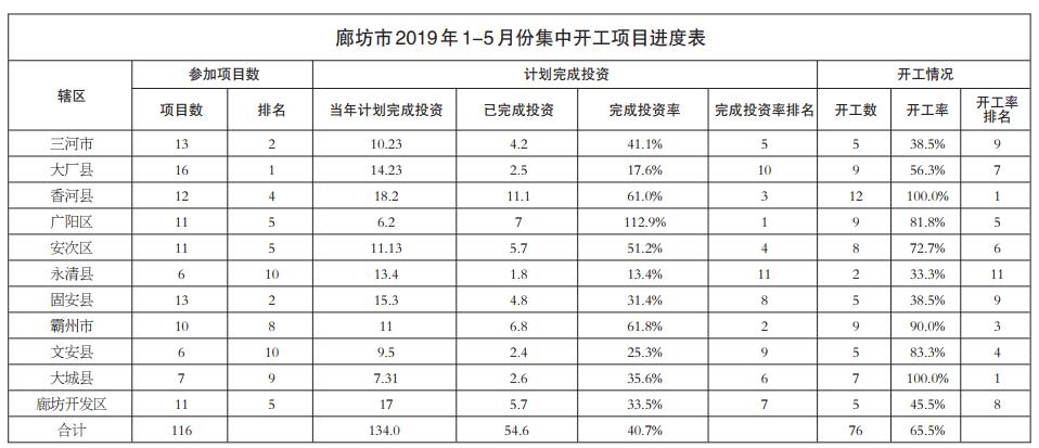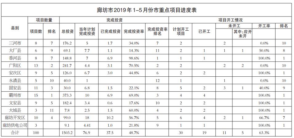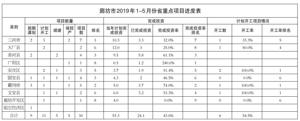 廊坊市2019年1-5月份省、市重點項目和集中開工項目進展情況通報