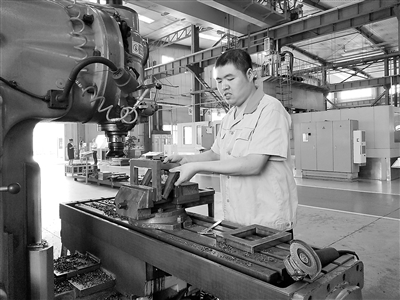 圖為工作人員在立式升降臺銑床操作臺上進行工件加工。