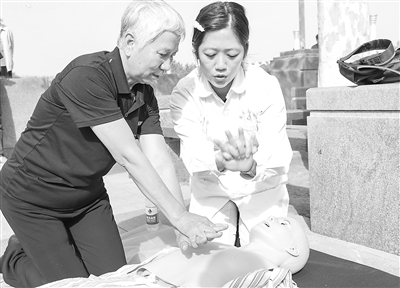 圖為醫(yī)務(wù)人員手把手教市民急救技巧。 記者 吳瓊 攝