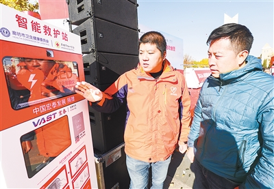 志愿者向市民介紹智能救護(hù)站使用方法。 記者 吳瓊 攝