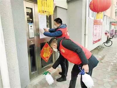 社區(qū)工作人員張貼公告并進(jìn)行消毒。記者 楊雅淇 攝