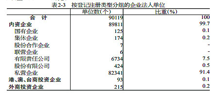 2018年末,全市共有第二產(chǎn)業(yè)和第三產(chǎn)業(yè)的企業(yè)法人單位90119個(gè),比2013年末增加70446個(gè),增長(zhǎng)3.6倍。其中,內(nèi)資企業(yè)占99.7%,港、澳、臺(tái)商投資企業(yè)占0.1%,外商投資企業(yè)占0.2%。內(nèi)資企業(yè)中,國(guó)有企業(yè)占全部企業(yè)法人單位的0.1%,私營(yíng)企業(yè)占91.4%(詳見(jiàn)表2-3)。