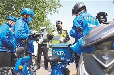 在市區(qū)廣陽道與裕華路交口的燕青崗,交警加大現(xiàn)場執(zhí)法和勸導(dǎo)力度,嚴(yán)管不按規(guī)定通行的行為。充分借助交通技術(shù)監(jiān)控等取證設(shè)備,加大對非機動車闖紅燈等違法行為的查糾力度,提升查處效能,擴大震懾作用。同時,交警還現(xiàn)場向外賣小哥和快遞小哥宣傳交通法規(guī)相關(guān)知識以及處罰辦法。