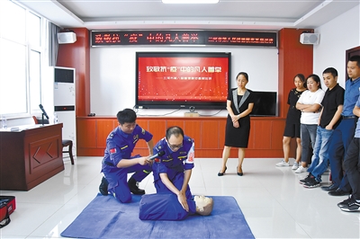 藍(lán)天救援隊員向干部職工演示講解心肺復(fù)蘇手法。
