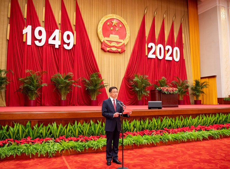 人民大會(huì)堂宴會(huì)廳鮮花綻放,洋溢著熱烈喜慶的節(jié)日氣氛。主席臺(tái)上方,莊嚴(yán)的國(guó)徽高懸,“1949—2020”的大字年號(hào)在鮮艷的紅旗映襯下格外醒目。
