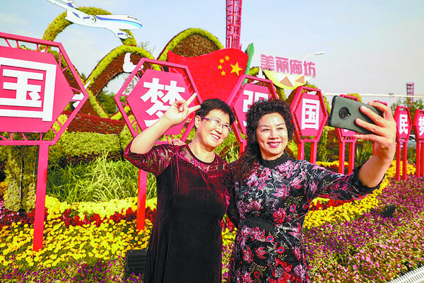 圖為市民在藝術(shù)大道與銀河路交口東北角花壇邊拍照留念。 記者 賈珺 攝