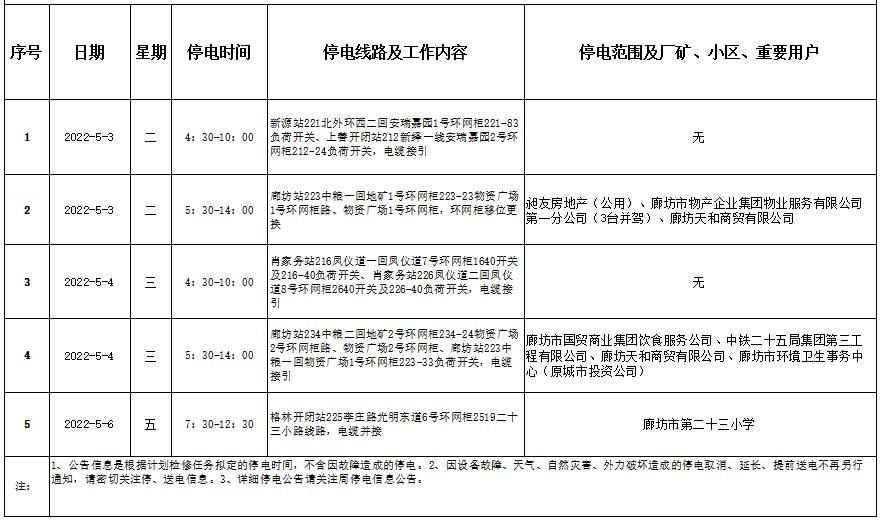 廊坊市區(qū)停電信息公告(第十九周)