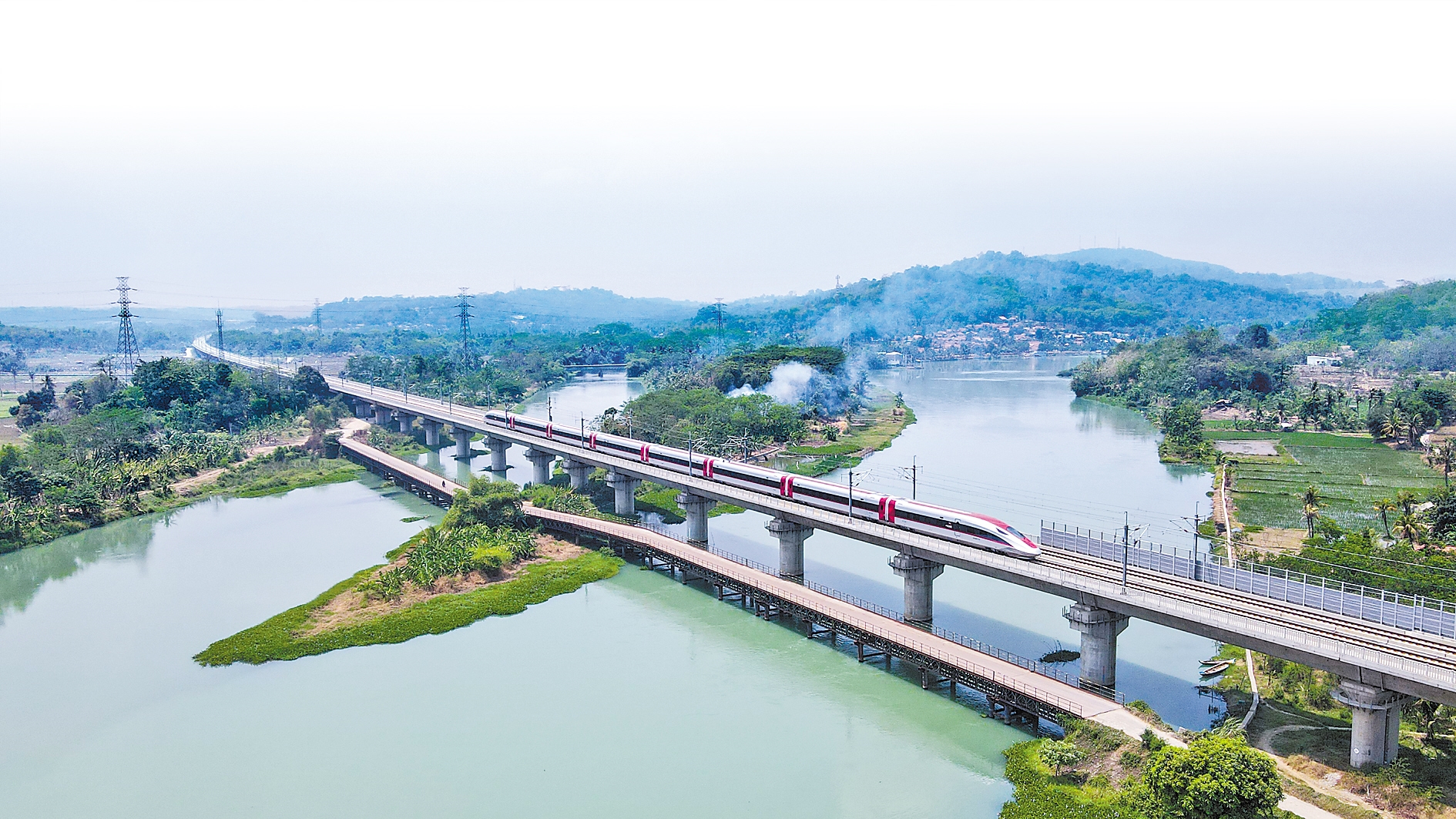 這是在印度尼西亞普哇加達(dá)拍攝的一列行駛中的雅萬(wàn)高鐵高速動(dòng)車(chē)組(9月30日攝,無(wú)人機(jī)照片)。新華社記者 徐 欽攝