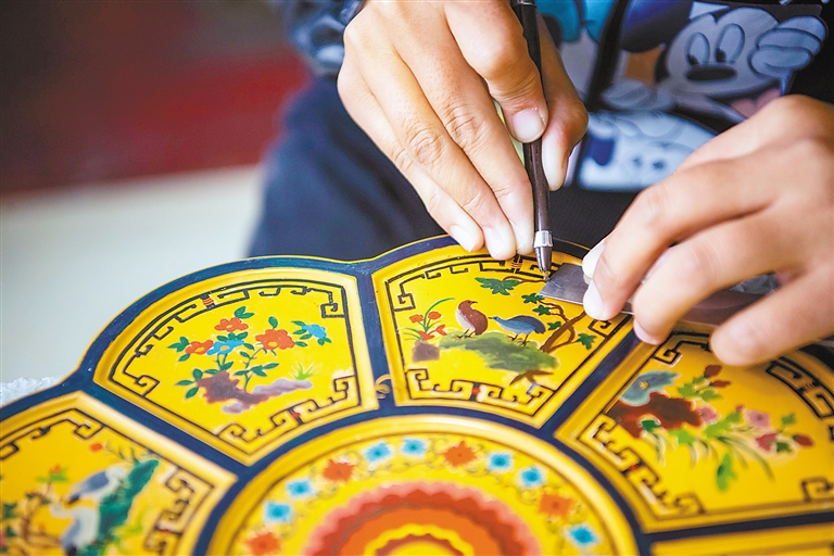 在村鎮(zhèn)的一個小型工作室,河北省級非遺項目金漆彩繪髹飾技藝傳承人劉秀娟正在仔細勾勒漆器上的圖案?!白鳛橐环N古老的漆器工藝,金漆彩繪髹飾技藝是以黑、黃、紅等漆胎為底色,從而展現作品的光彩。我在保持宮廷傳統工藝技法和藝術風格的同時,還將中國畫中的滃染、點暈、皴法等融入其中?!眲⑿憔暌贿吋氈鹿蠢展P下的圖案一邊說。