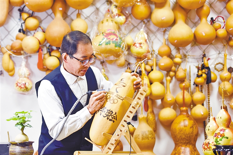 廊坊市非物質文化遺產葫蘆烙畫傳承人吳宗正制作烙畫葫蘆作品“魂牽冬奧”。 通訊員 孫寶宇 攝