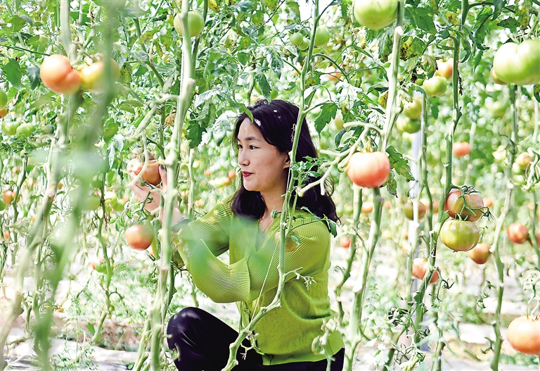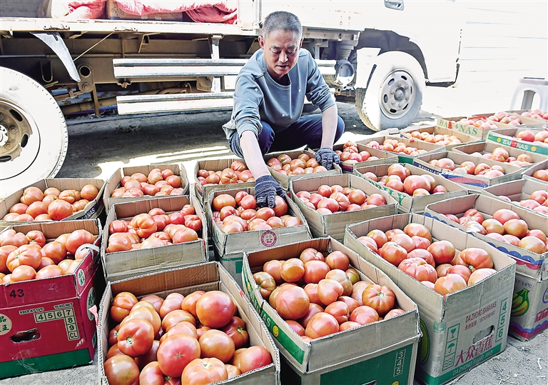 里坦鎮(zhèn)一村一家設(shè)施大棚內(nèi),農(nóng)民將采收的西紅柿裝箱發(fā)出。