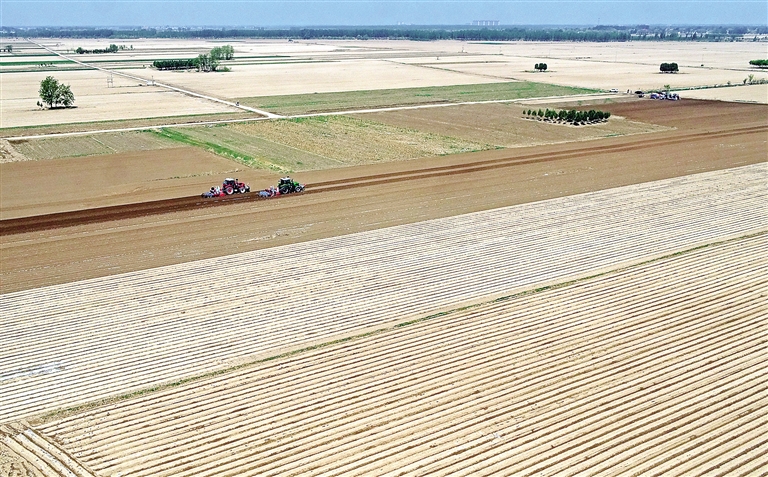 在北魏鎮(zhèn)牛莊村花生種植基地,農(nóng)民正駕駛農(nóng)機播種花生。 (無人機照片)