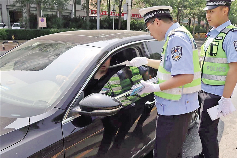 交警發(fā)放拒絕車窗拋物宣傳單。記者 張歡 攝