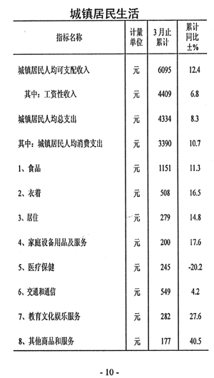 一一收入穩(wěn)步增加。一季度,城鎮(zhèn)居民人均可支配收入6095元,同比增加671元,增長(zhǎng)12.4%;在崗職工平均工資8641元,同比增加412元,增長(zhǎng)5.0%。