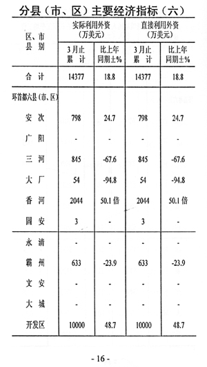 ? 一一外資較快增長(zhǎng)。實(shí)際利用外資完成14377萬(wàn)美元,增長(zhǎng)18.8%,同比提高78.6個(gè)百分點(diǎn)。14377萬(wàn)美元全部為外商直接投資。