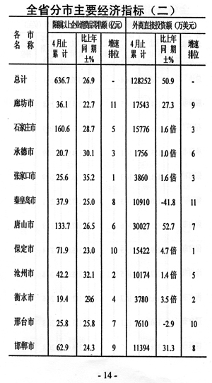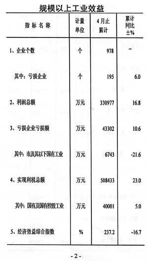 效益增幅減緩。前四個月規(guī)模以上工業(yè)企業(yè)實現(xiàn)利稅和利潤分別為50.8億元和33.1億元,同比分別增長23.0%和16.8%,與一季度相比增速分別回落了6.5個和7.8個百分點。