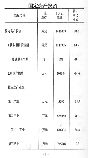 一一投資增長較快。固定資產(chǎn)投資完成141.7億元,增長28.0%,與前兩個月相比增速提高1.0個百分點,與上年同期相比增速回落1.6個百分點。其中第二產(chǎn)業(yè)增速最高為90.1%。房地產(chǎn)投資增速下降44.0%。