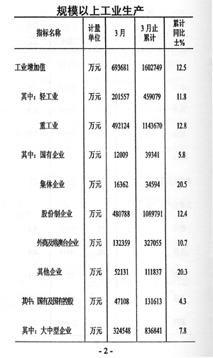 ——工業(yè)穩(wěn)定增長。全市規(guī)模以上工業(yè)實現(xiàn)增加值160.3億元,增長12.5%,與前兩個月相比增速提高0.1個百分點,與上年同期相比增速回落1.1個百分點。其中重工業(yè)完成增加值114.4億元,增長12.8%,快于輕工業(yè)1.0個百分點。