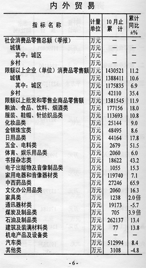 ——消費(fèi)有所回落。全市限額以上企業(yè)消費(fèi)品零售額實(shí)現(xiàn)143.1億元,增長(zhǎng)11.2%,與上月相比回落2.1個(gè)百分點(diǎn)。其中,城鎮(zhèn)實(shí)現(xiàn)消費(fèi)品零售額138.8億元,增長(zhǎng)10.6%;鄉(xiāng)村實(shí)現(xiàn)4.2億元,增長(zhǎng)35.4%。