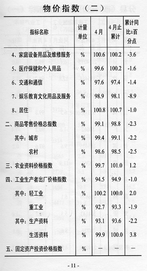 ——物價(jià)低位運(yùn)行。全市居民消費(fèi)價(jià)格總指數(shù)99.8,同比回落2.4個(gè)百分點(diǎn);商品零售價(jià)格總指數(shù)98.8,同比回落2.3個(gè)百分點(diǎn);農(nóng)業(yè)生產(chǎn)資料價(jià)格指數(shù)101.0,同比提高1.2個(gè)百分點(diǎn);工業(yè)生產(chǎn)者出廠價(jià)格指數(shù)94.9,同比回落1.0個(gè)百分點(diǎn)。