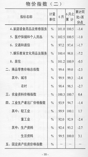 ——物價低位運行。全市居民消費價格總指數(shù)99.9,同比回落2.3個百分點;商品零售價格總指數(shù)99.0,同比回落2.5個百分點;農(nóng)業(yè)生產(chǎn)資料價格指數(shù)100.7,同比提高0.4個百分點;工業(yè)生產(chǎn)者出廠價格指數(shù)94.7,同比回落1.4個百分點。