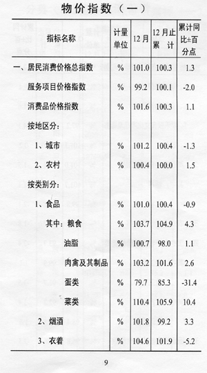 ——物價低位運行。居民消費價格總指數(shù)100.3,同比回落1.3個百分點:商品零售價格總指數(shù)99.6,回落1.5個百分點;農(nóng)業(yè)生產(chǎn)資料價格指數(shù)99.7,回落1.8個百分點;工業(yè)生產(chǎn)者出廠價格指數(shù)93.7,回落2.4個百分點。