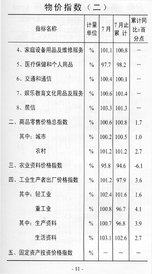——物價總體平穩(wěn)。全市居民消費(fèi)價格總指數(shù)101.3,同比提高1.3個百分點(diǎn);商品零售價格總指數(shù)100.8,同比提高1.7個百分點(diǎn);農(nóng)業(yè)生產(chǎn)資料價格指數(shù)94.6,同比回落6.1個百分點(diǎn);工業(yè)生產(chǎn)者出廠價格指數(shù)97.9,同比提高3.6個百分點(diǎn)。