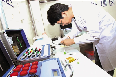 圖為艾禾豐農(nóng)貿(mào)市場(chǎng)檢查員正在對(duì)蔬菜小樣進(jìn)行殘留農(nóng)藥檢測(cè)。