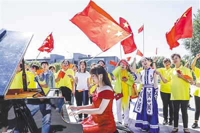 9月18日,大廠回族自治縣舉辦“我和我的祖國(guó)”主題快閃活動(dòng),千余名群眾用歌聲和舞蹈表達(dá)對(duì)祖國(guó)的祝福,慶祝新中國(guó)成立70周年。圖為群眾在大廠回族自治縣民族宮合唱《我和我的祖國(guó)》,參加快閃活動(dòng)。